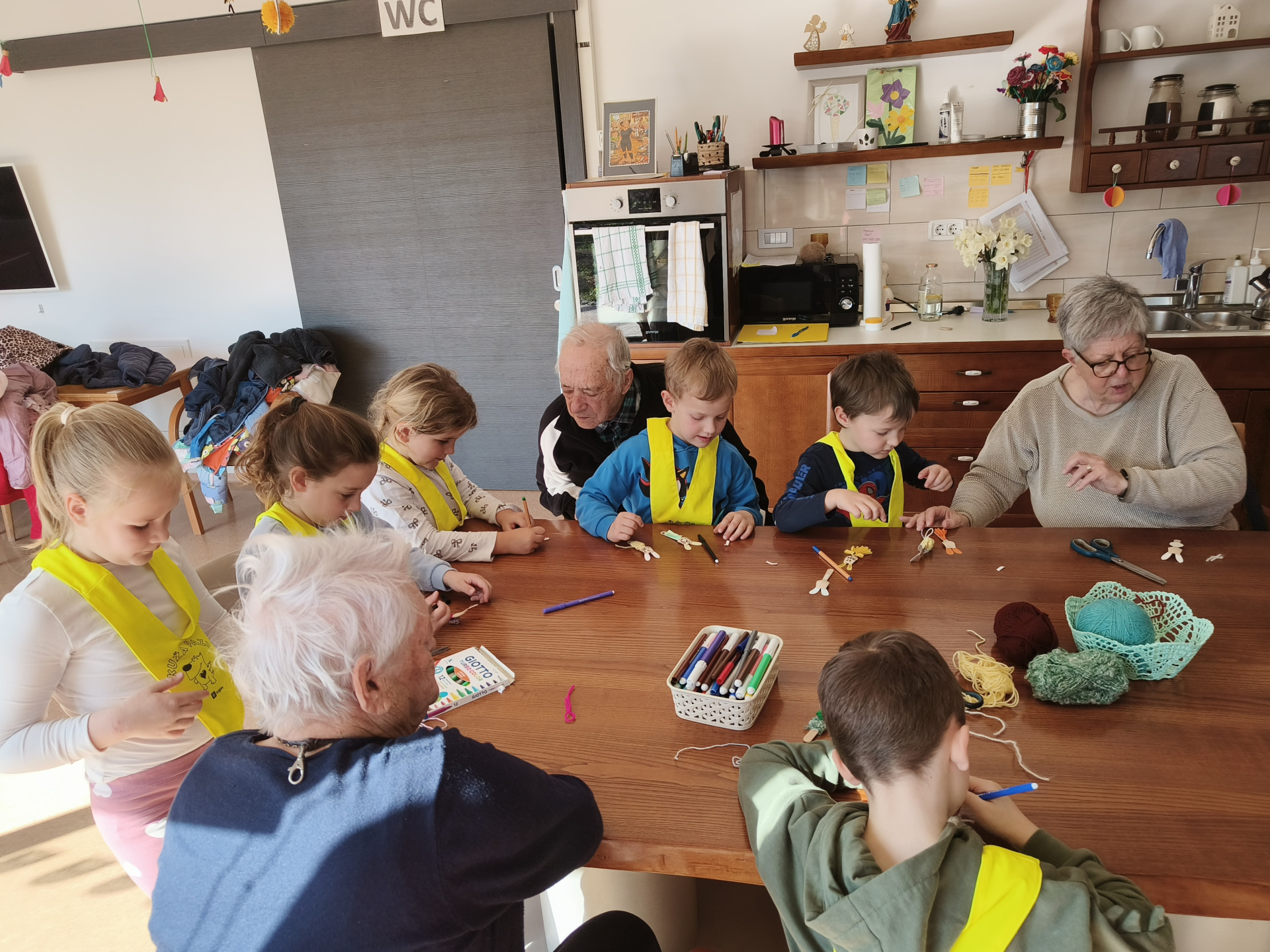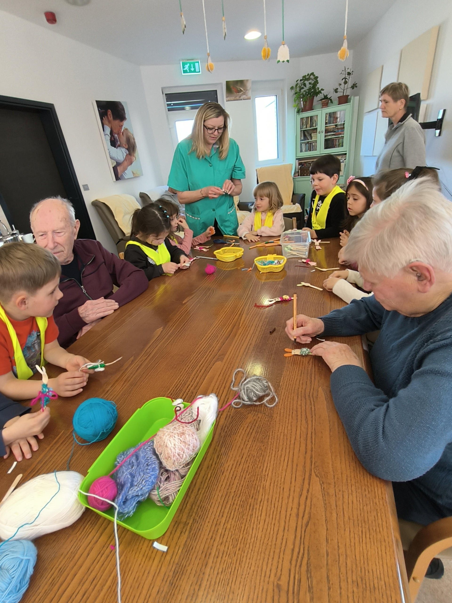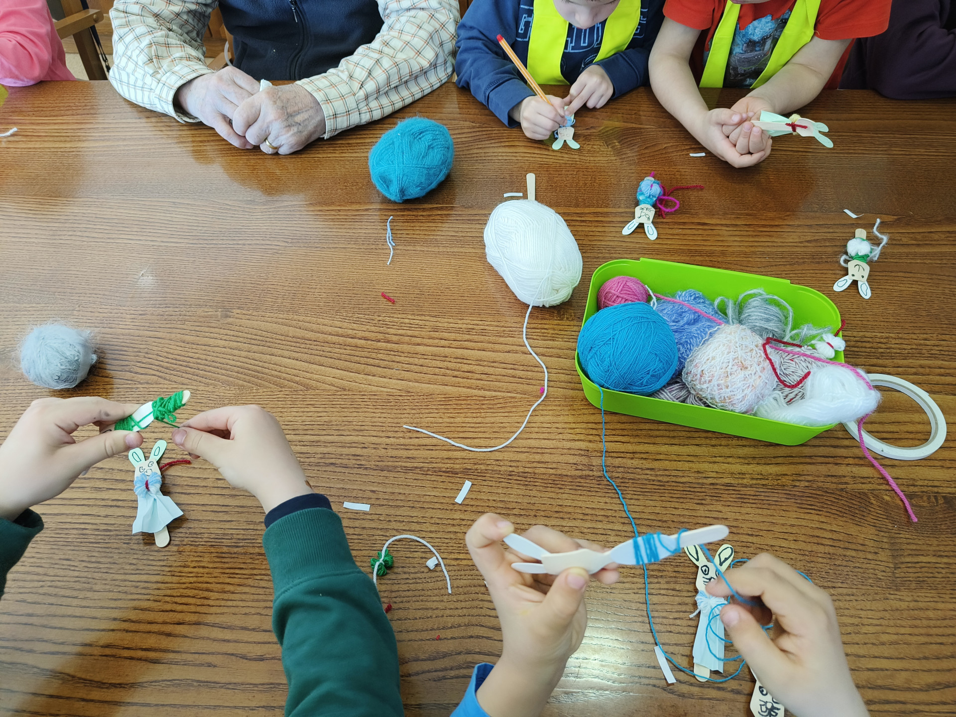 Najstarejši otroci iz vrtca Miren, skupina Raki, smo obiskali varovance v Hiši dobre volje v Mirnu. Otroci so v hišo prinesli dobro voljo, nasmeh in energijo ter s tem starejšim polepšali dan. Skupaj smo izdelovali zajčke – fantke in punčke. Pri delu smo uporabljali male lesene žličke, volno in flomastre. Gubali smo papir, ovijali volno ter zajčkom narisali obraz.