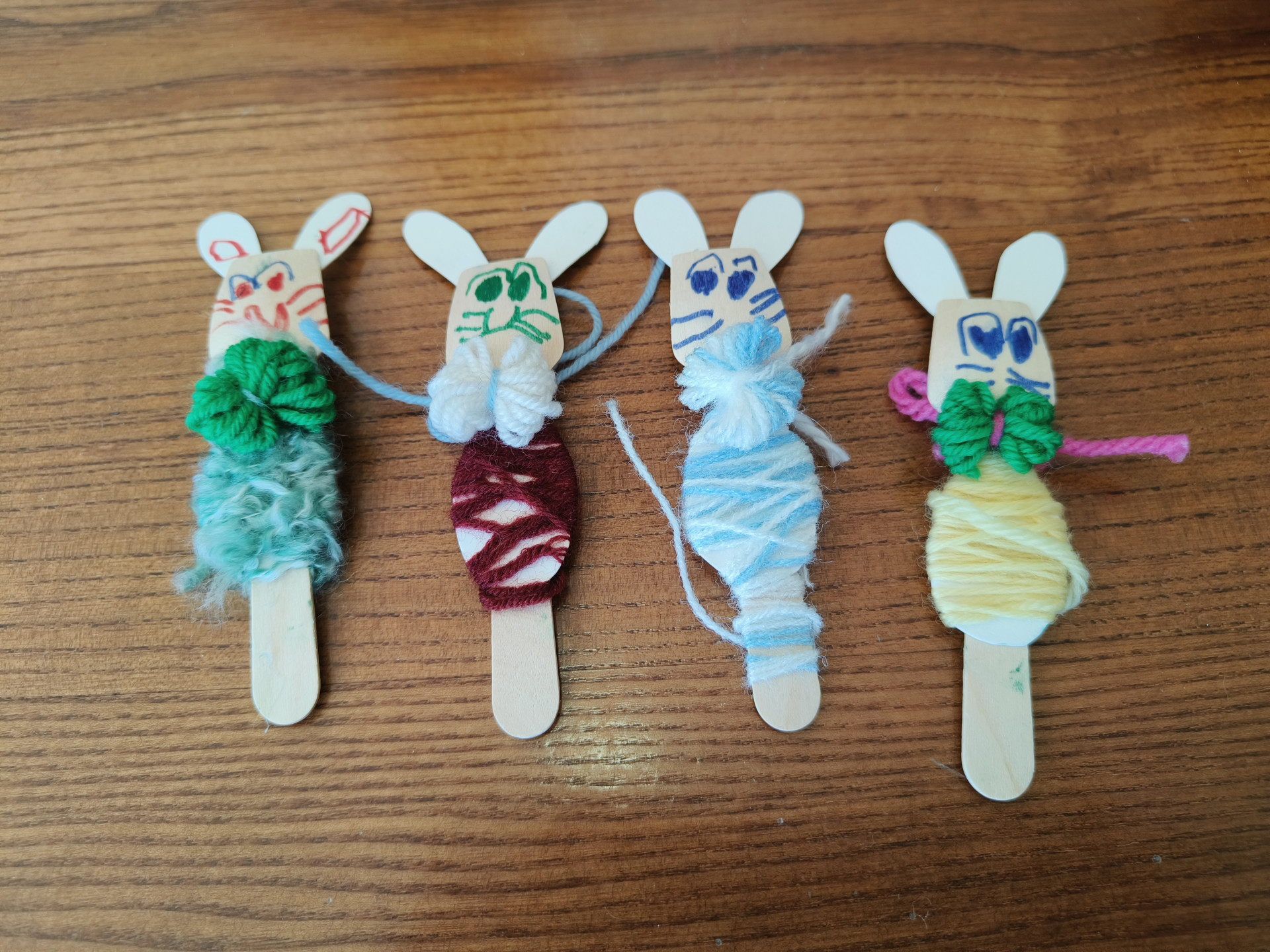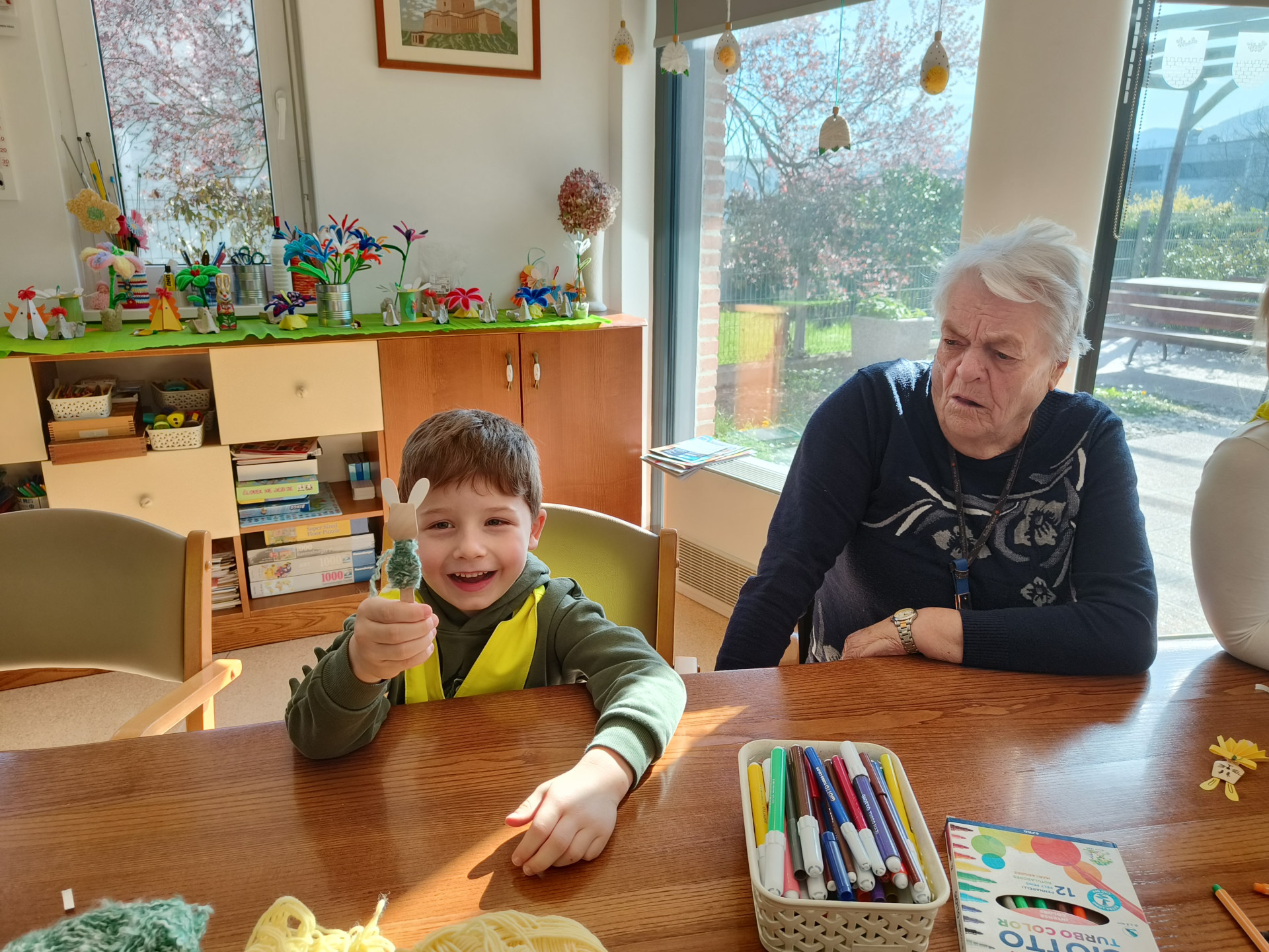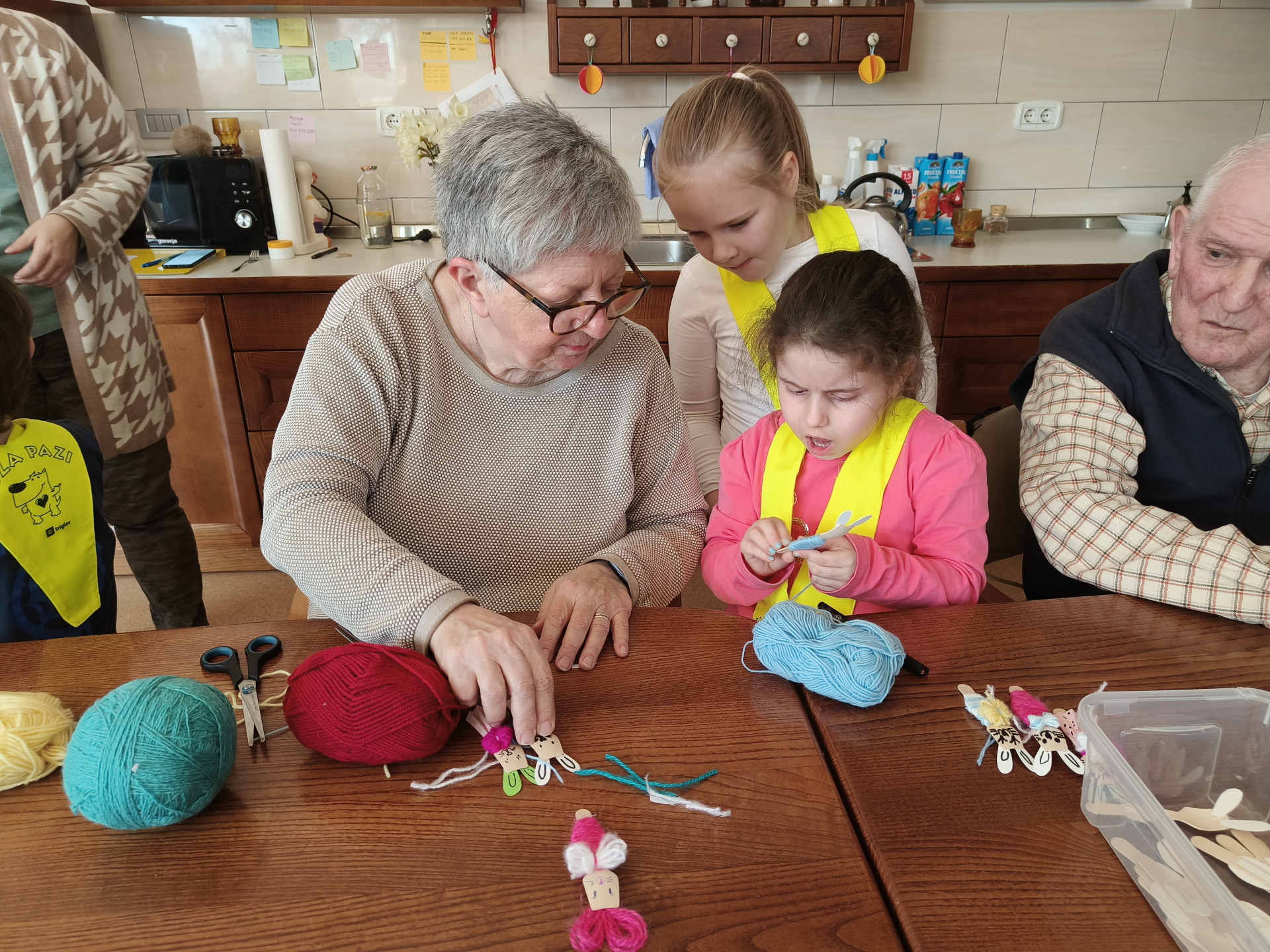 Najstarejši otroci iz vrtca Miren, skupina Raki, smo obiskali varovance v Hiši dobre volje v Mirnu. Otroci so v hišo prinesli dobro voljo, nasmeh in energijo ter s tem starejšim polepšali dan. Skupaj smo izdelovali zajčke – fantke in punčke. Pri delu smo uporabljali male lesene žličke, volno in flomastre. Gubali smo papir, ovijali volno ter zajčkom narisali obraz.